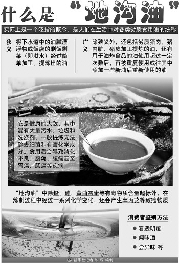 研究表明,長期攝入地溝油會對人體造成明顯傷害,如發(fā)育障礙、易患腸炎,并有肝、心和腎腫大以及脂肪肝等病變。而地溝油中的主要危害物之一黃曲霉素是一種強(qiáng)烈的致癌物質(zhì),其毒性是砒霜的100倍。另一個問題是倫理上的,別人吃過的油,在下水道里變質(zhì),再撈上來,你能吃得下去嗎? 那么,有沒有一種簡便的方法,可以鑒別地溝油呢?我們不妨聽聽食品科學(xué)專家和業(yè)內(nèi)人士怎么說。 1、科學(xué)鑒別地溝油 目前沒有好辦法 在一個注重食品安全的時代,理想的狀態(tài)是,你下館子,隨手掏出一張?jiān)嚰埥讲死?過一會兒拿出來跟譜表比比,然后大叫:“掌柜的,換油!” 2、傳統(tǒng)的檢測方法 都有一定局限性 在科研工作者看來,治理地溝油的難點(diǎn)在于,經(jīng)過洗滌、蒸餾、脫色、脫臭等精煉過程后,單從外觀和感官上,很難區(qū)分地溝油和普通油。不法商販還會把地溝油摻入食用油中,如果含量較少,更是難以檢測。 3、鑒別地溝油 冰箱顯身手? 曾在北京多家大酒樓擔(dān)任總廚、高管的特級廚師馮鵬說,一般情況下,地溝油和普通油無法區(qū)分,進(jìn)貨時難免上當(dāng)。他只能通過實(shí)踐來判斷:飯館炒菜之前一般要先過油,在這道“滑油”工序中,好油可反復(fù)使用七八次,而地溝油最多使用三次就會變黏,而且有哈喇味兒。 “另外,室外溫度較低時,地溝油會像棕櫚油一樣凝固,所以常有人用地溝油冒充棕櫚油。”馮鵬說,冬天可以據(jù)此鑒別地溝油,夏天則可通過冰箱來檢驗(yàn)。一些媒體認(rèn)為地溝油有味道,可以聞出來,此外里面含水多,下鍋會爆響,馮鵬認(rèn)為這些都是無稽之談,因?yàn)樗緭讲贿M(jìn)油中,且地溝油也沒什么異味。 4、我們該如何 鑒別地溝油? 一看。看透明度,純凈的植物油呈透明狀,在生產(chǎn)過程中由于混入了堿脂、蠟質(zhì)、雜質(zhì)等物,透明度會下降;看色澤,純凈的油為無色,在生產(chǎn)過程中由于油料中的色素溶于油中,油才會帶色;看沉淀物,其主要成分是雜質(zhì)。 二聞。每種油都有各自獨(dú)特的氣味。可以在手掌上滴一兩滴油,雙手合攏摩擦,發(fā)熱時仔細(xì)聞其氣味。有異味的油,說明質(zhì)量有問題,有臭味的很可能就是地溝油;若有礦物油的氣味更不能買。 三嘗。用筷子取一滴油,仔細(xì)品嘗其味道。口感帶酸味的油是不合格產(chǎn)品,有焦苦味的油已發(fā)生酸敗,有異味的油可能是地溝油。 四聽。取油層底部的油一兩滴,涂在易燃的紙片上,點(diǎn)燃并聽其響聲。燃燒正常無響聲的是合格產(chǎn)品;燃燒不正常且發(fā)出“吱吱”聲音的,水分超標(biāo),是不合格產(chǎn)品;燃燒時發(fā)出“噼啪”爆炸聲,表明油的含水量嚴(yán)重超標(biāo),而且有可能是摻假產(chǎn)品,絕對不能購買。 五問。問商家的進(jìn)貨渠道,必要時索要進(jìn)貨發(fā)票或查看當(dāng)?shù)厥称沸l(wèi)生監(jiān)督部門抽樣檢測報告。 |